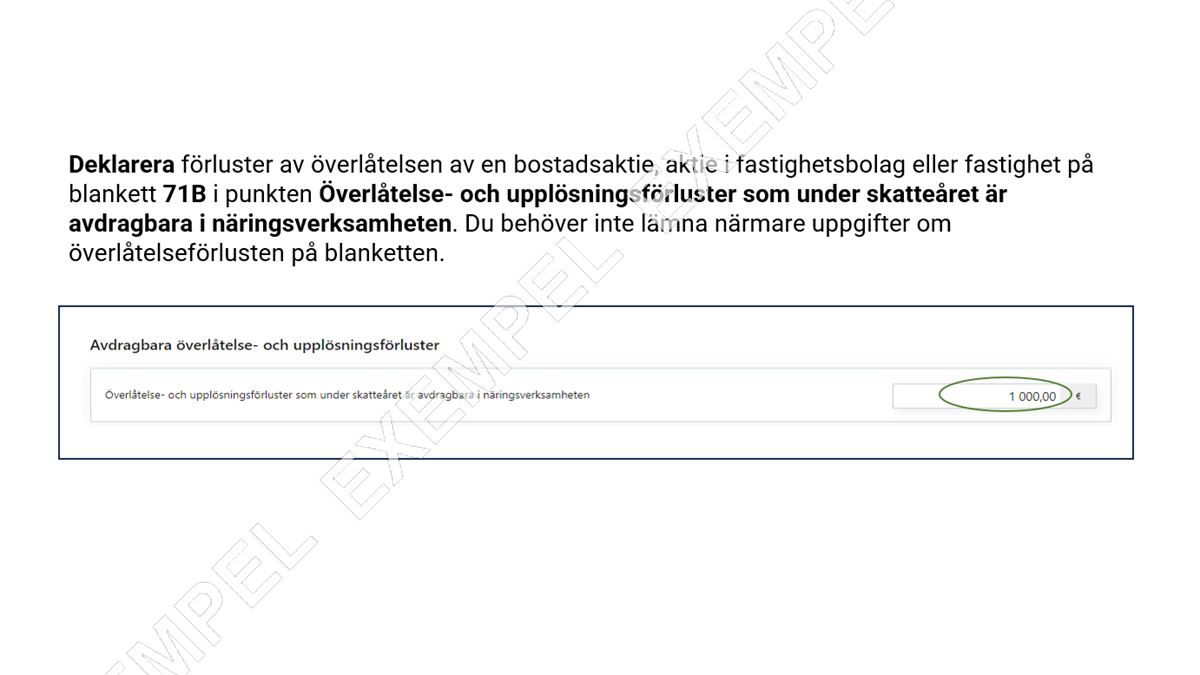 Deklarera förluster av överlåtelsen av en bostadsaktie, aktie i fastighetsbolag eller fastighet på blankett 71B i punkten Överlåtelse- och upplösningsförluster som under skatteåret är avdragbara i näringsverksamheten. Du behöver inte lämna närmare uppgifter om överlåtelseförlusten på blanketten.