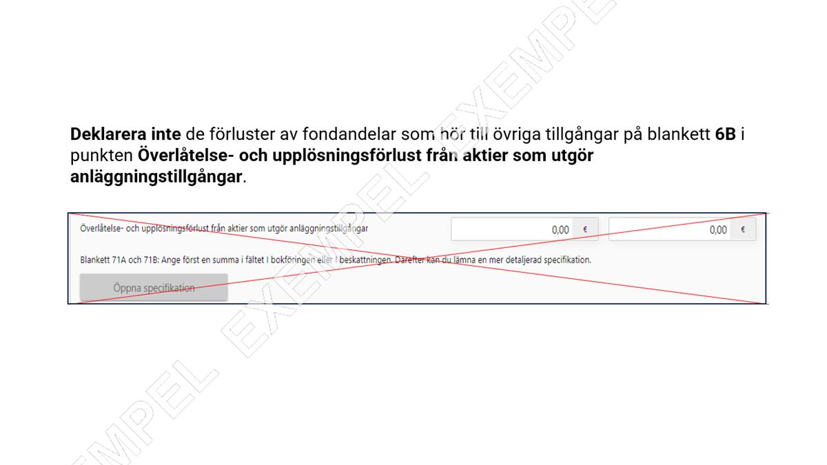 Deklarera inte de förluster av fondandelar som hör till övriga tillgångar på blankett 6B i punkten Överlåtelse- och upplösningsförlust från aktier som utgör anläggningstillgångar.
