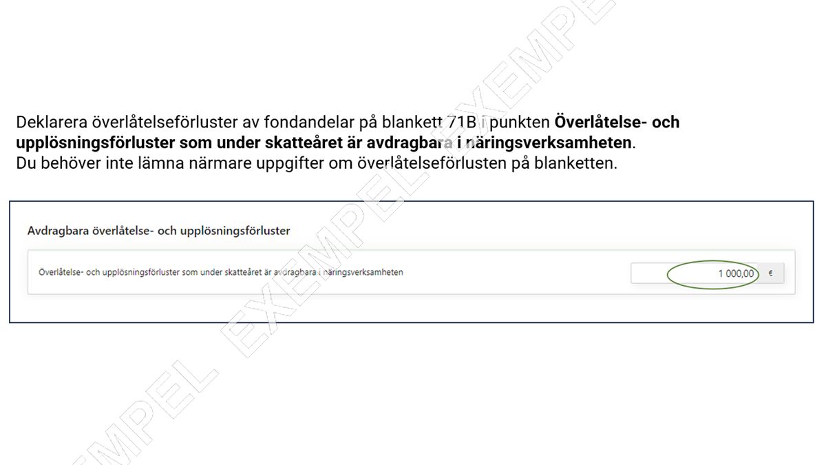 Deklarera överlåtelseförluster av fondandelar på blankett 71B i punkten Överlåtelse- och upplösningsförluster som under skatteåret är avdragbara i näringsverksamheten. Du behöver inte lämna närmare uppgifter om överlåtelseförlusten på blanketten.