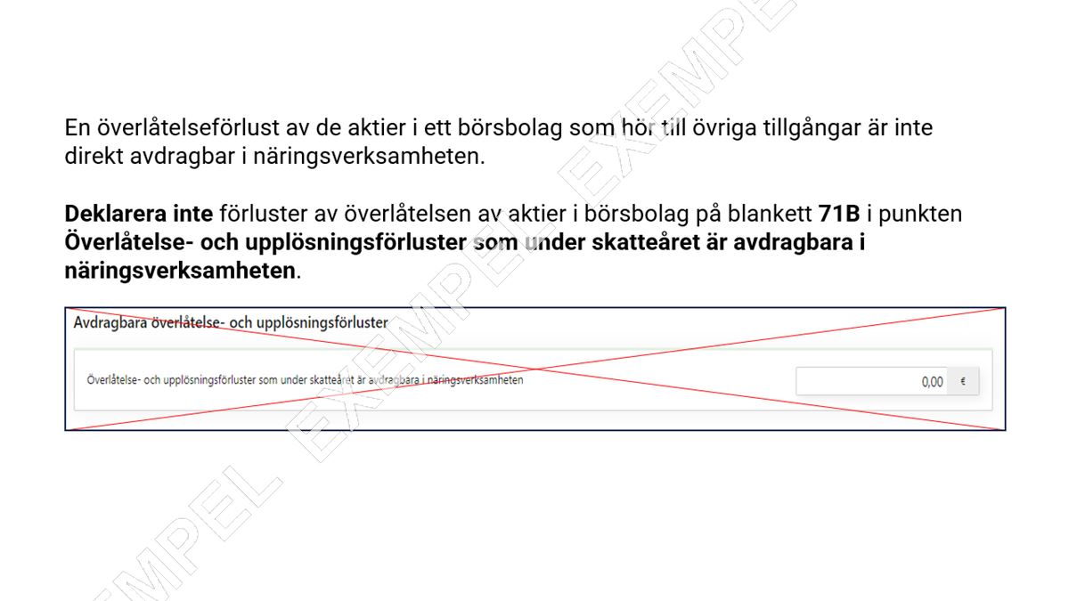 Deklarera inte förluster av överlåtelsen av aktier i börsbolag på blankett 71B i punkten Överlåtelse- och upplösningsförluster som under skatteåret är avdragbara i näringsverksamheten.