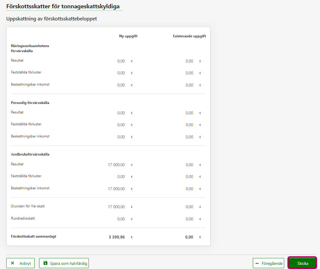 Fasen Resultat: Om du ansöker om förskottsskatt för den innevarande eller följande skatteperioden, ska du välja om du anger endast resultatet eller en mer detaljerad uträkning av resultatet. Fyll i de uppgifter som behövs.