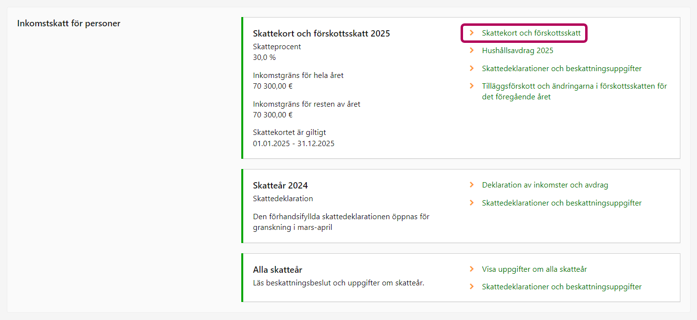 Välj i sektionen Inkomstskatt för personer i punkten Skattekort och förskottsskatt 2026 länken Skattekort och förskottsskatt.