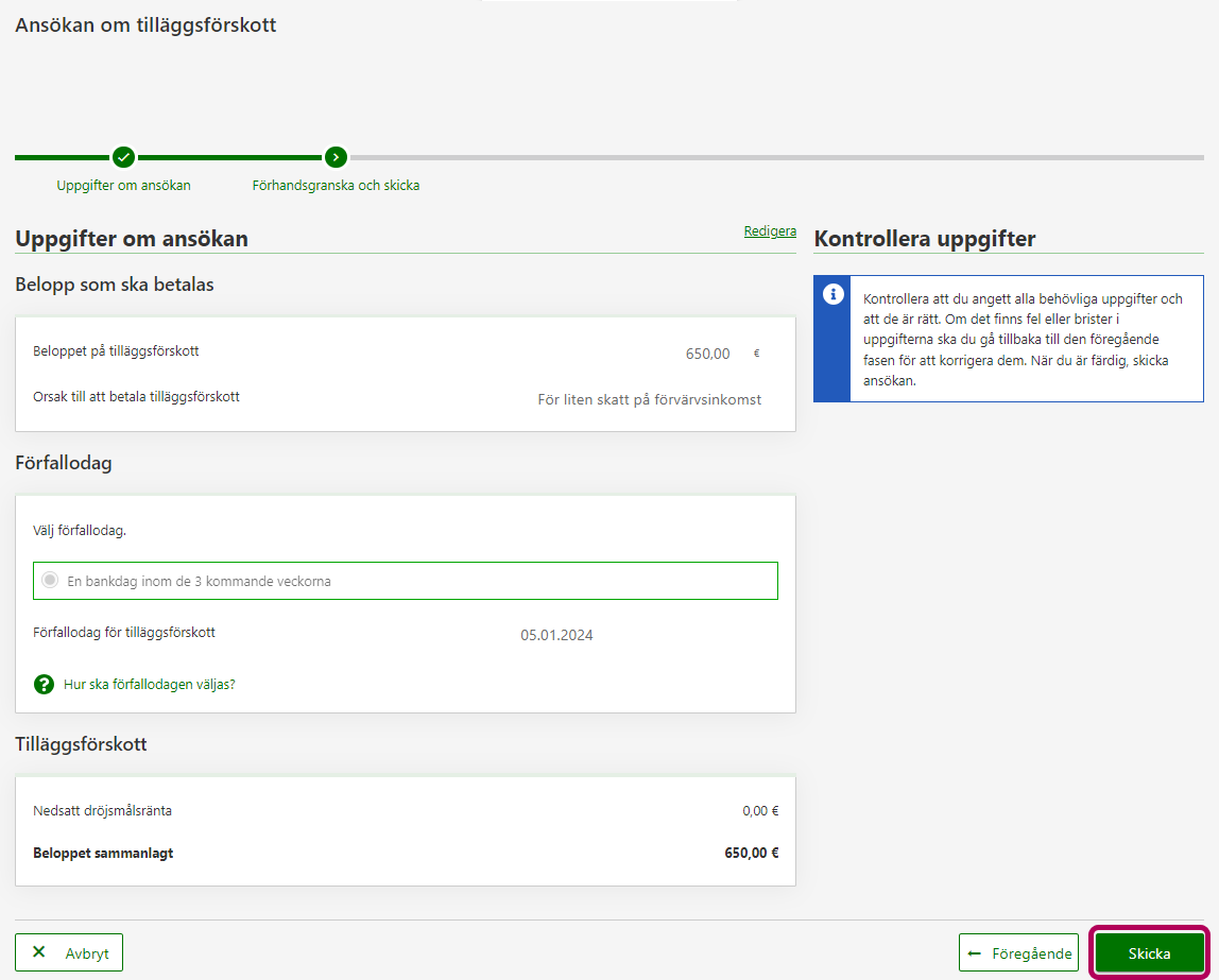 Fasen Förhandsgranska och skicka: Kontrollera att uppgifterna är rätt. Du kan korrigera uppgifter genom att välja Redigera eller Föregående.