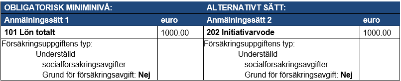 Exempel 1: En arbetsgivare betalare ett initiativarvode på 1 000 euro till en inkomsttagare. Arbetsgivaren kan anmäla inkomsten antingen med inkomstslaget Lön totalt (anmälningssätt 1) eller med det kompletterande inkomstslaget Initiativarvode (anmälningssätt 2).