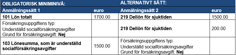 Exempel 4: En arbetsgivare betalar dellön för sjuktiden på 1 700 euro till en inkomsttagare. Såväl i inkomstslaget Lön totalt som i inkomstslaget Dellön för sjuktiden är förvalet att betalningen är underställd socialförsäkringsavgifter. Beloppet innehåller 200 euro som inte är underställd socialförsäkringsavgifter.
