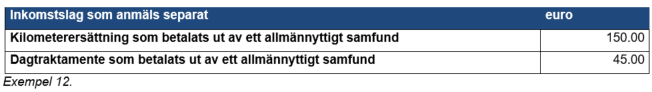 Exempel 12: Ett allmännyttigt samfund betalade enligt förhandsöverenskommelsen en skattefri kilometerersättning på 150 euro till en frivillig handledare för ledandet av sagogymnastikstunder. Därtill representerade handledaren samfundet vid ett förbundsmöte, och för denna resa betalade samfundet skattefritt ett heldagstraktamente och ett partiellt dagtraktamente (sammanlagt 45 euro) och därtill tågbiljetter och en hotellövernattning. Samfundet anmäler kilometerersättningen och dagtraktamentena till inkomstregistret. Resebiljetten för kollektivtrafiken och inkvarteringsersättningen anmäls inte.