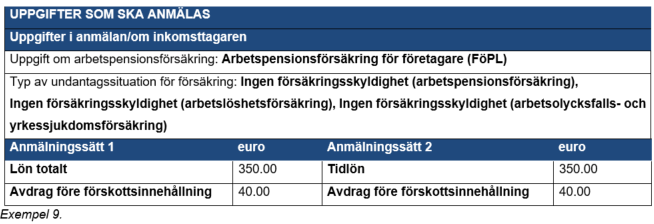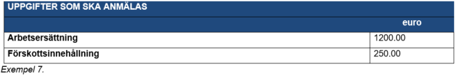 Exempel 6: Personen utför ett konsultuppdrag för ett ministerium. Personen har ingen FöPL-försäkring på grund av att verksamheten är småskalig. Personen är inte införd i förskottsuppbördsregistret och hen har överlämnat ett skattekort till betalaren, på vilket förskottsinnehållningsprocenten är 40 %. Ministeriet anmäler den arbetsersättning som den betalat till inkomstregistret under inkomstslaget Arbetsersättning och den förskottsinnehållning som den verkställt under inkomstslaget Förskottsinnehållning. Ministeriet anmäler inte arbetstagarens arbetspensionsförsäkringsavgift som det innehållit av personen.