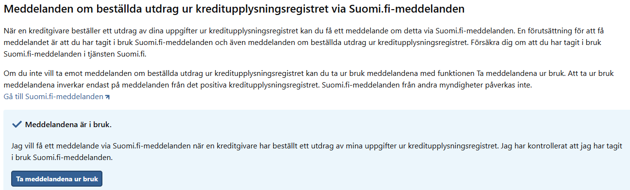 Om du inte vill få meddelanden kan du ändra på meddelandeinställningarna i det positiva kreditupplysningsregistrets e-tjänst. Inställningarna finns i punkten Meddelanden om beställda utdrag ur kreditupplysningsregistret via Suomi.fi-meddelanden på sidan Utdrag ur kreditupplysningsregistret.