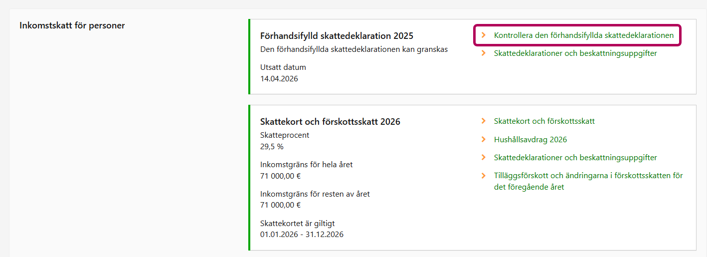 Välj i sektionen Inkomstskatt för personer i punkten Skatteår 2025 länken Kontrollera den förhandsifyllda skattedeklarationen.