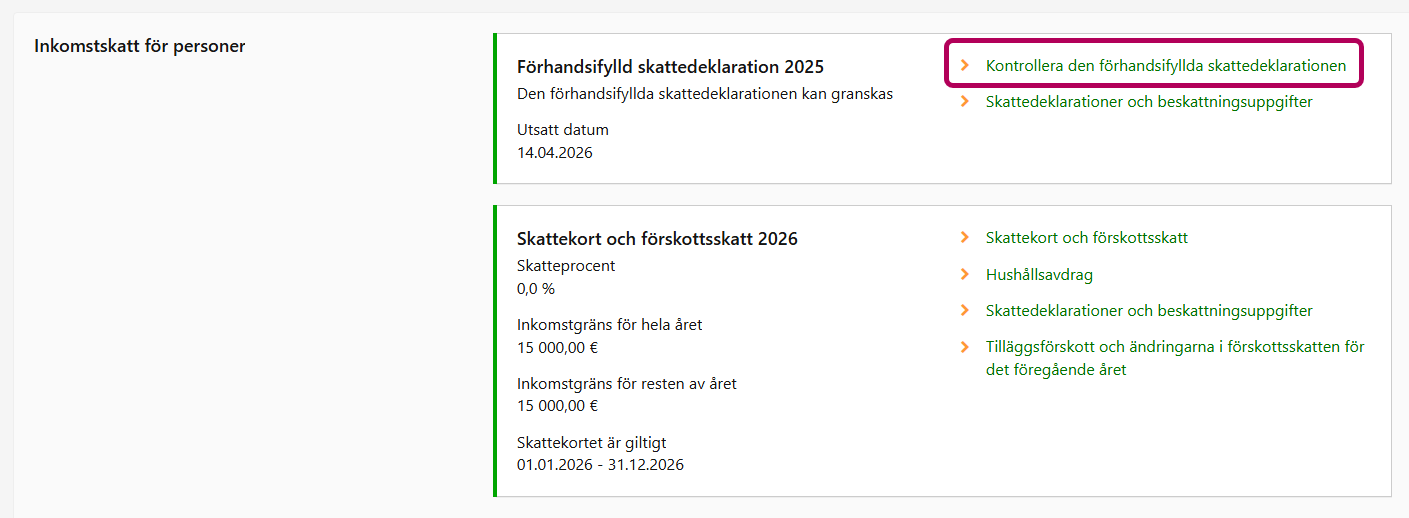 Välj i sektionen Inkomstskatt för personer i punkten Förhandsifylld skattedeklaration 2025 länken Kontrollera den förhandsifyllda skattedeklarationen.