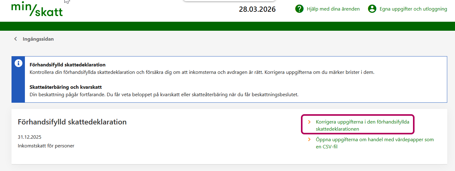 Välj länken Korrigera uppgifterna i den förhandsifyllda skattedeklarationen.