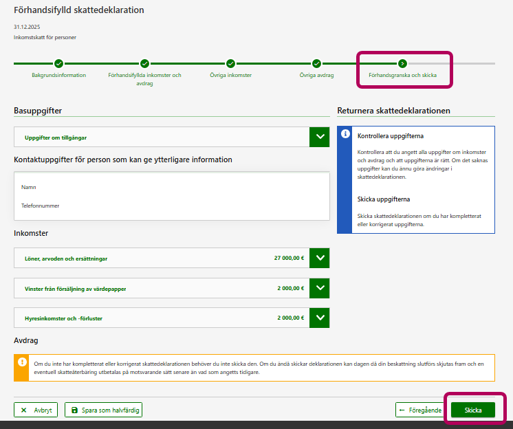 - Om du vill fortsätta med att fylla i senare ska du välja knappen Spara som halvfärdig. Uppgifterna bevaras i två veckor. Skatteförvaltningen behandlar inte uppgifterna förrän du skickat dem.