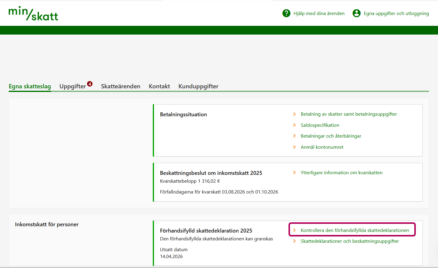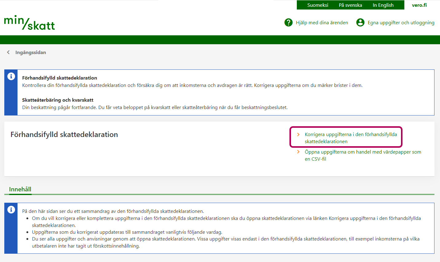 Om du har lämnat uppgiften om hushållsavdrag tidigare, till exempel i din ansökan om skattekort eller förskottsskatt, visas den i fasen Förhandsifyllda inkomster och avdrag. Korrigera uppgifter i den här fasen. Uppgifterna visas förhandsifyllda också om du har kommit överens om att företaget som utförde arbetet anmäler uppgifterna för dig.