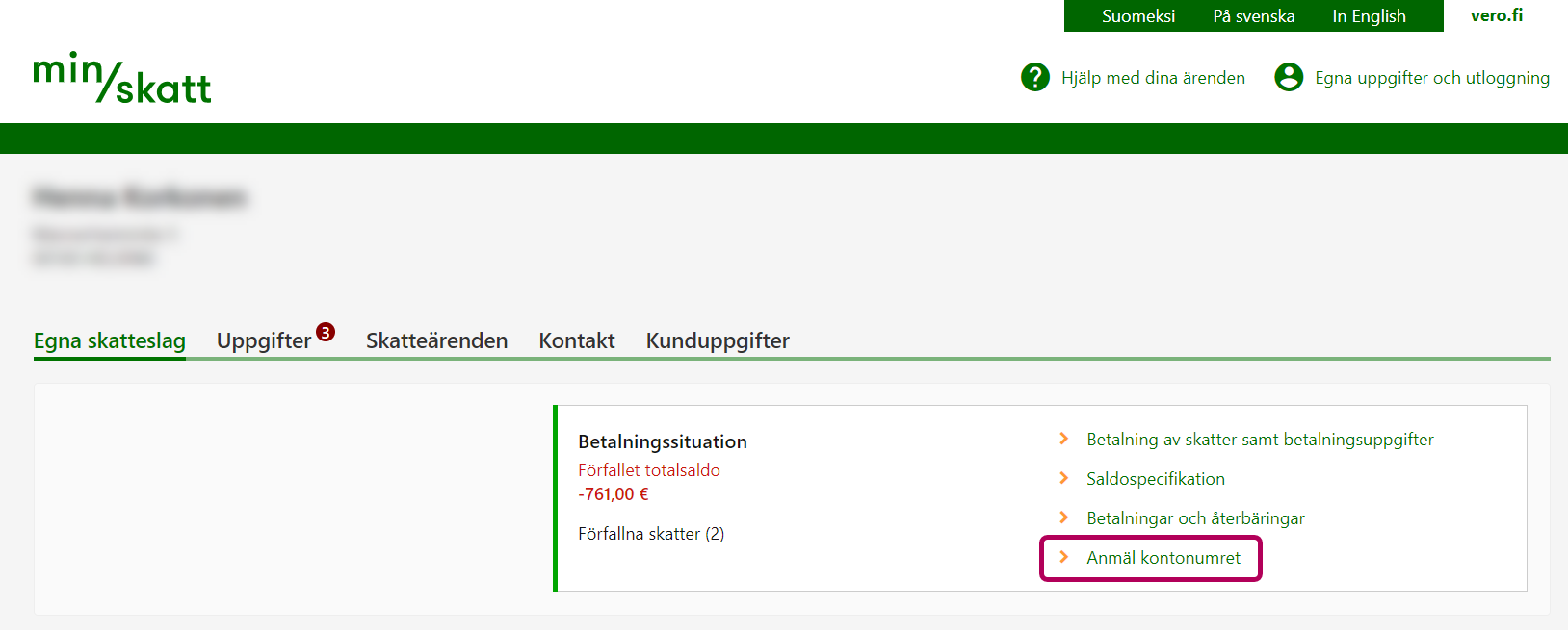När du anmäler kontonumret i MinSkatt uppdateras det genast i Skatteförvaltningens uppgifter. Du kan inte anmäla kontonumret per telefon.