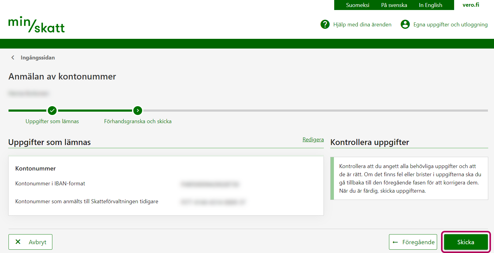 Fasen Förhandsgranska och skicka: Kontrollera att uppgifterna är rätt. Välj till sist knappen Skicka.