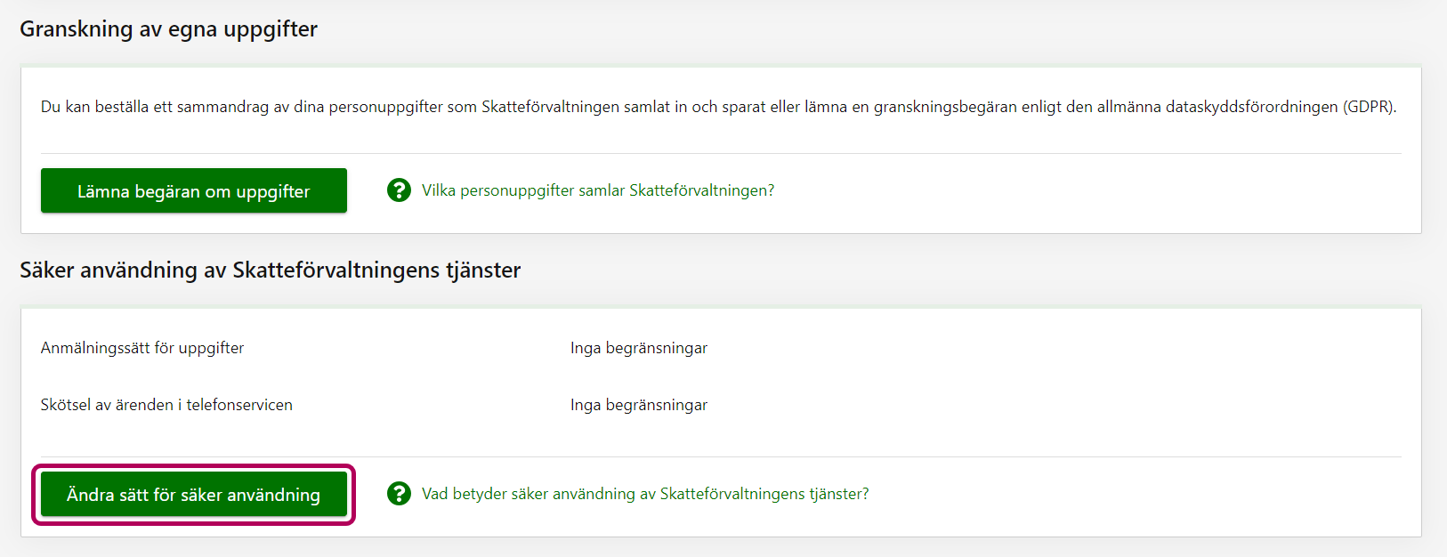 - Rulla ner till punkten Säker användning av Skatteförvaltningens tjänster.