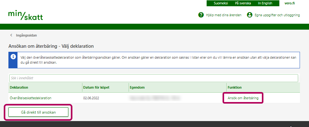 Välj länken Ansök om återbäring vid den deklaration som ansökan gäller. Då visas de uppgifter som lämnats i överlåtelseskattedeklarationen färdigt i ansökan om återbäring.