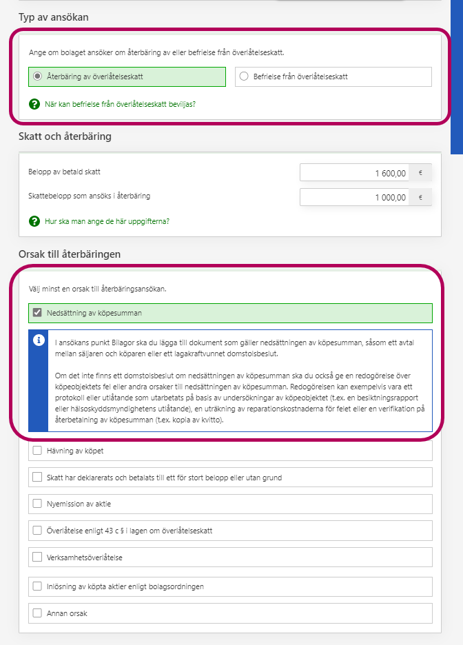 Ange i punkten Typ av ansökan om bolaget ansöker om återbäring av eller befrielse från överlåtelseskatt. Berätta orsaken till återbäringen eller befrielsen. Kontrollera också vilka bilagor som behövs till ansökan.