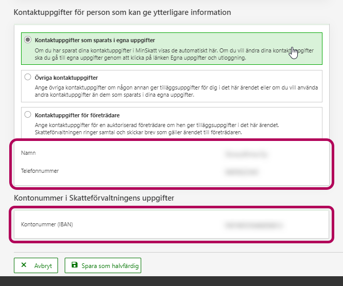 I punkten Kontaktuppgifter för person som kan ge ytterligare information visas de kontaktuppgifter som Skatteförvaltningen har. Om någon annan lämnar tilläggsuppgifter om ansökan ska du lämna hens kontaktuppgifter.
