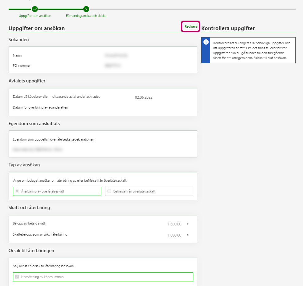 Kontrollera uppgifterna i ansökan. Vid behov kan du ännu redigera uppgifter via länken Redigera. När alla uppgifter är rätt ska du välja knappen Skicka.
