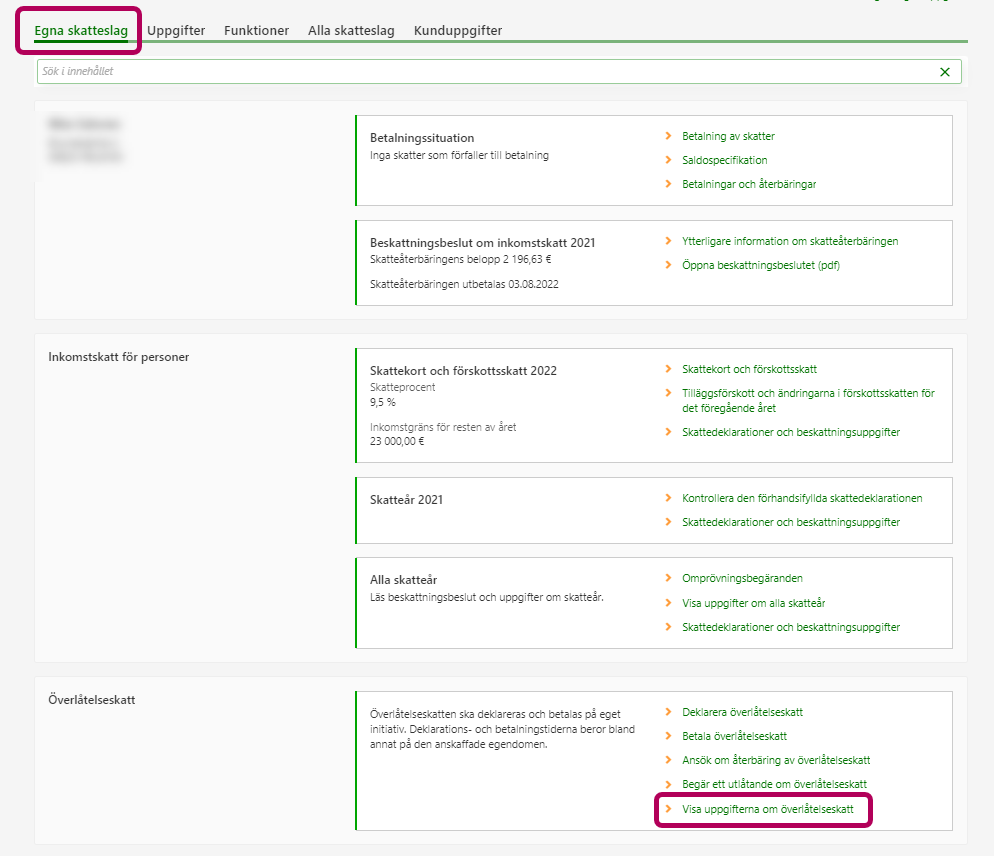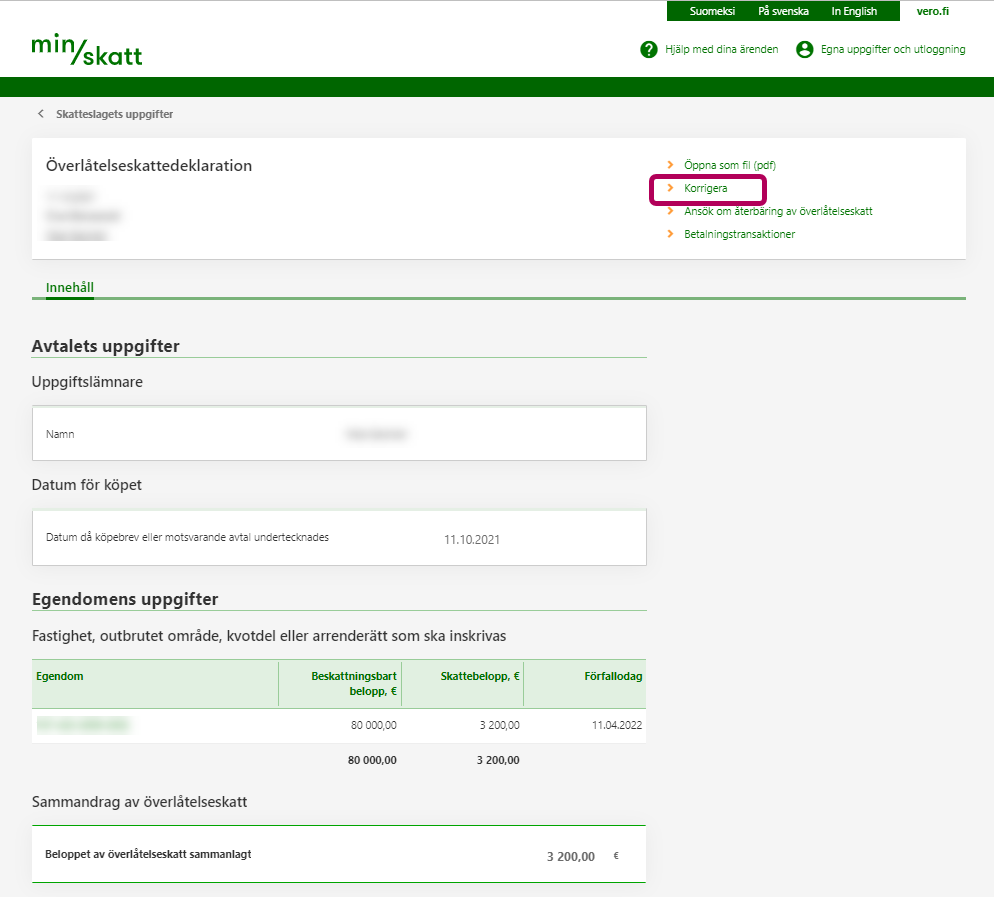 När du korrigerar deklarationen ska du på ingångssidan i MinSkatt gå till sektionen Överlåtelseskatt och välja länken Visa uppgifterna om överlåtelseskatt.