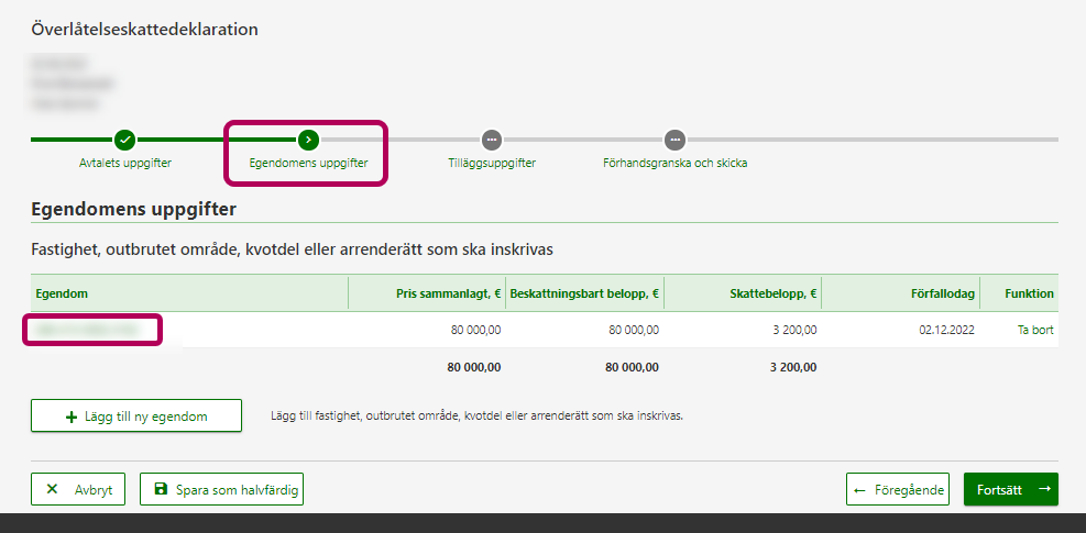 Ange dröjsmålsförhöjningen på överlåtelseskattedeklarationen i fasen Egendomens uppgifter. Välj den egendom vars uppgifter du korrigerar.