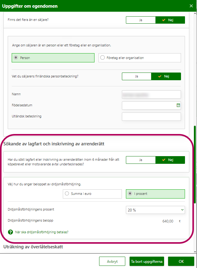 Ange dröjsmålsförhöjningen antingen i euro eller i procent när du beräknat den från överlåtelseskatten. Om du anger procentandelen beräknar MinSkatt beloppet i euro.
