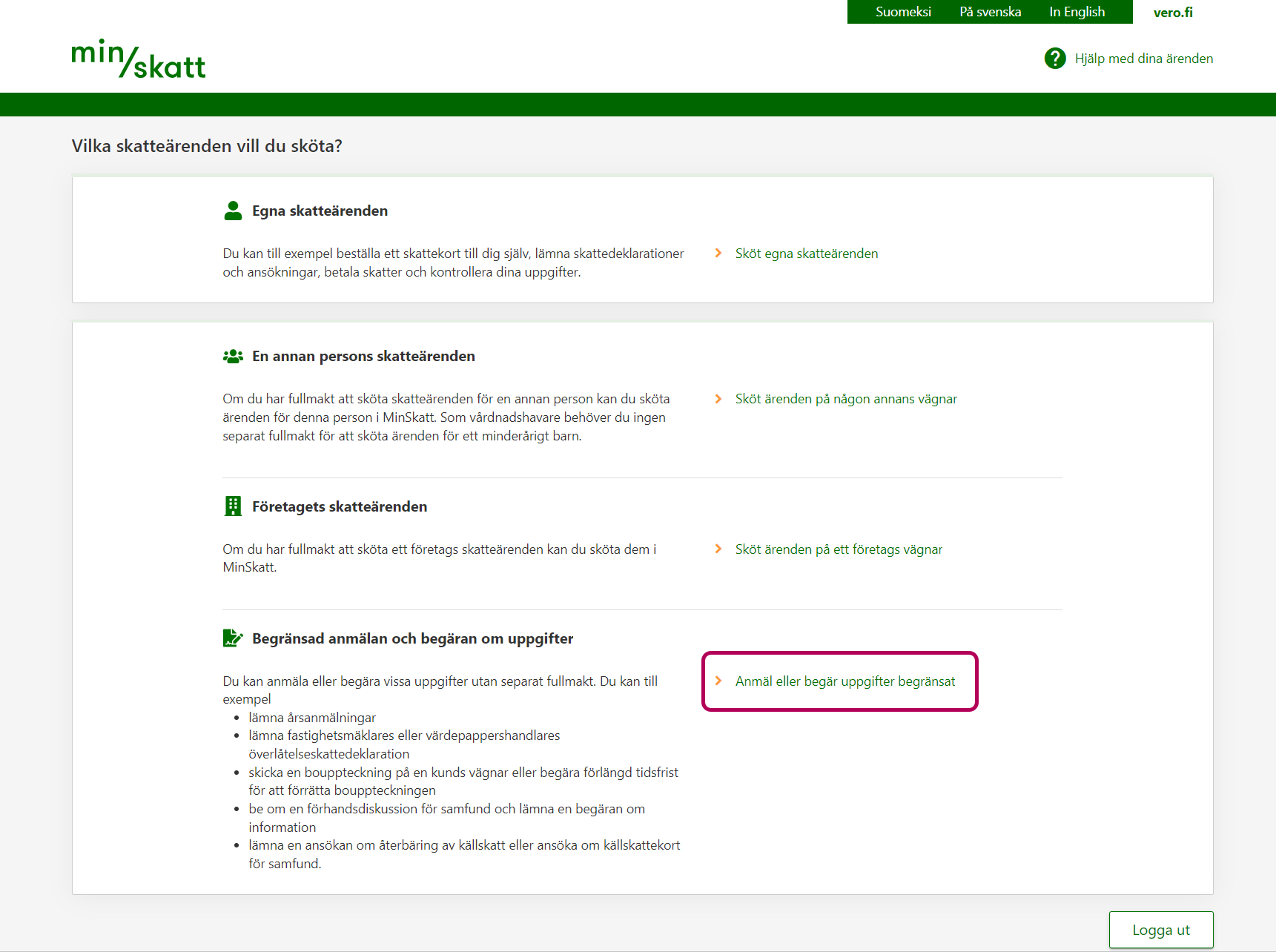 Välj länken Anmäl eller begär uppgifter begränsat.
