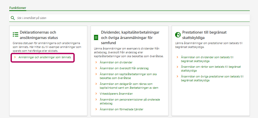 Välj på ingångssidan i punkten Deklarationernas och ansökningarnas status länken Anmälningar, och ansökningar som lämnats.
