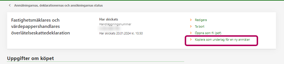 - När deklarationen har statuset Har tagits emot kan du till underlag kopiera den deklaration som du lämnat tidigare.