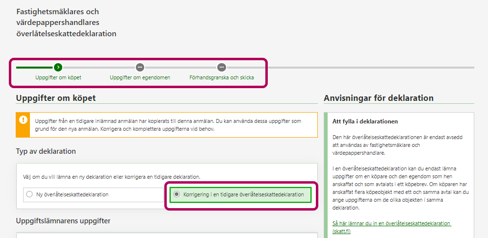 Om någon annan har lämnat överlåtelseskattedeklarationen kan du lämna en ersättande deklaration genom att fylla i alla uppgifterna på nytt efter att du i början av deklarationen har valt punkten Korrigering i en tidigare överlåtelseskattedeklaration.
