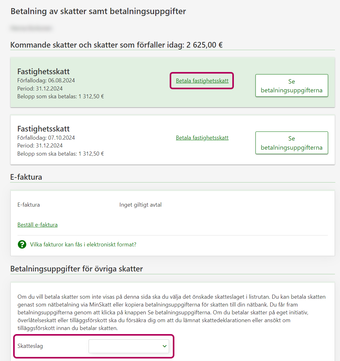 Om du vill betala skatter som inte visas på sidan ska du gå till punkten Betalningsuppgifter för alla skatter och välja det önskade skatteslaget.