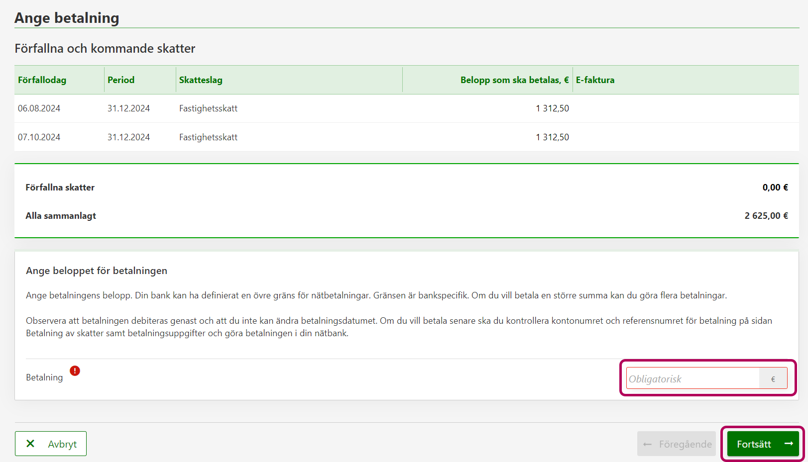 Ange betalningens belopp. Om en skatt har förfallit till betalning har beloppet antecknats färdigt. Vid behov kan du ändra på beloppet.