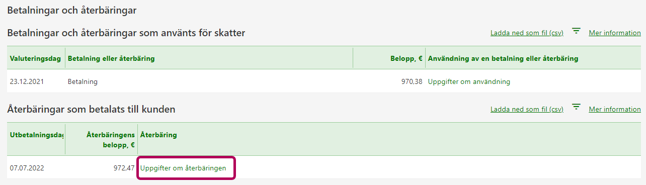 I tabellen Betalningar och återbäringar som använts för skatter specificeras de inbetalningar och återbäringar som använts till att betala skatter samt andra eventuella krediterande transaktioner. Du ser en specifikation av hur inbetalningen har använts genom att välja länken Uppgifter om användning.