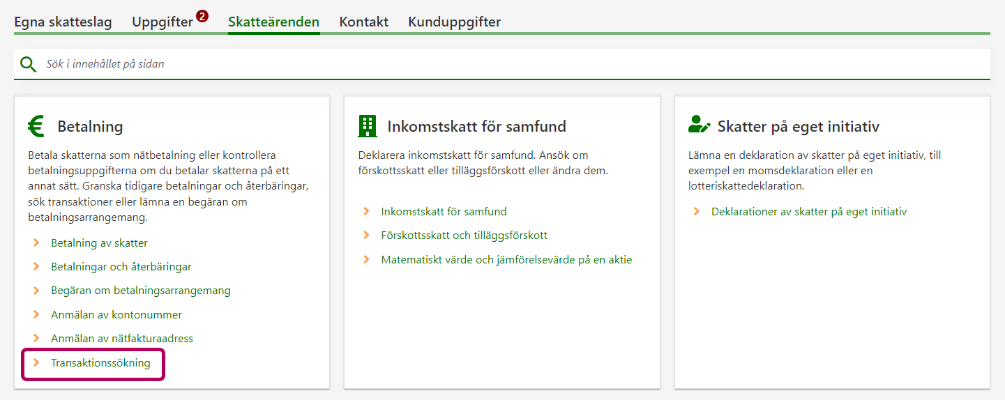 I MinSkatt kan du söka och granska transaktioner som gäller olika skatteslag. Du kan avgränsa sökresultaten med lämpliga sökvillkor.