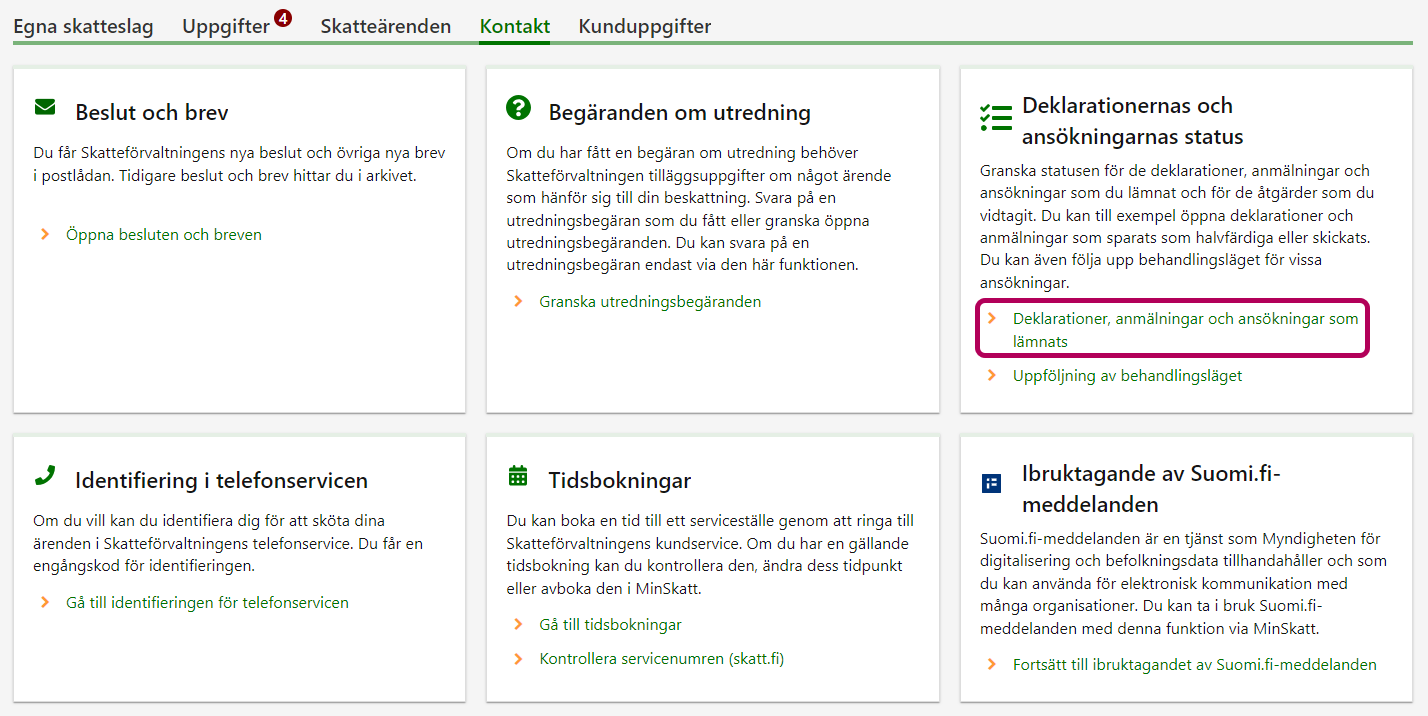 Välj i punkten Deklarationernas och ansökningarnas status länken Deklarationer, anmälningar och ansökningar som lämnats.