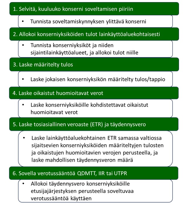 Soveltamisalaan kuuluvien konsernien on laskettava konserniyksiköiden tosiasiallinen veroaste verovuosikohtaisesti. Tosiasiallinen veroaste lasketaan lainkäyttöaluekohtaisesti kyseisellä lainkäyttöalueella sijaitsevien konserniyksiköiden kirjanpidon lukujen perusteella. Sijaintilainkäyttöalueen nimellisellä yhteisöverokannalla ei siis ole merkitystä tosiasiallisen veroasteen arvioinnissa, vaan laskenta tehdään konserniyksiköiden kirjanpidon tuloksen tai tappion ja verokulun pohjalta. Jos tosiasiallinen veroaste on jollain konserniyksiköiden sijaintilainkäyttöalueella alle 15 %, konsernin on maksettava täydennysveroa. Se, millä lainkäyttöalueella täydennysvero tulee maksettavaksi, määräytyy vähimmäisverojärjestelmän verotussääntöjen soveltamisjärjestyksen ja konsernirakenteen perusteella. Tosiasiallinen veroaste ja täydennysveron määrä lasketaan samalla tavalla riippumatta siitä, mitä verotussääntöä tilanteessa sovelletaan. Seuraavassa kuvassa (Kuva 1.) on esitetty vähimmäisverotuksen vaiheet.