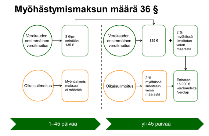 Myöhästymismaksu muodostuu päiväkohtaisesta ja veron määrän perusteella määräytyvästä myöhästymismaksusta. Myöhässä ilmoitetun veron määrä ei vaikuta päiväkohtaisen myöhästymismaksun määrään. Päiväkohtaista myöhästymismaksua määrätään kolme euroa jokaiselta päivältä, jolta veroilmoitus on myöhästynyt. Päivät, joilta myöhästymismaksu määrätään, lasketaan veroilmoituksen antamisen määräpäivää seuraavasta päivästä ilmoituksen antamispäivään. Päivällä tarkoitetaan kalenteripäivää eli myös viikonloppuja ja arkipyhiä. Myöhästymismaksua määrätään 45 kalenteripäivältä siten, ettei ilmoitettavan veron määrällä ole vaikutusta myöhästymismaksun määrään. Myöhästymismaksun määrä 45 päivältä on 135 euroa (OVML 36 §).
