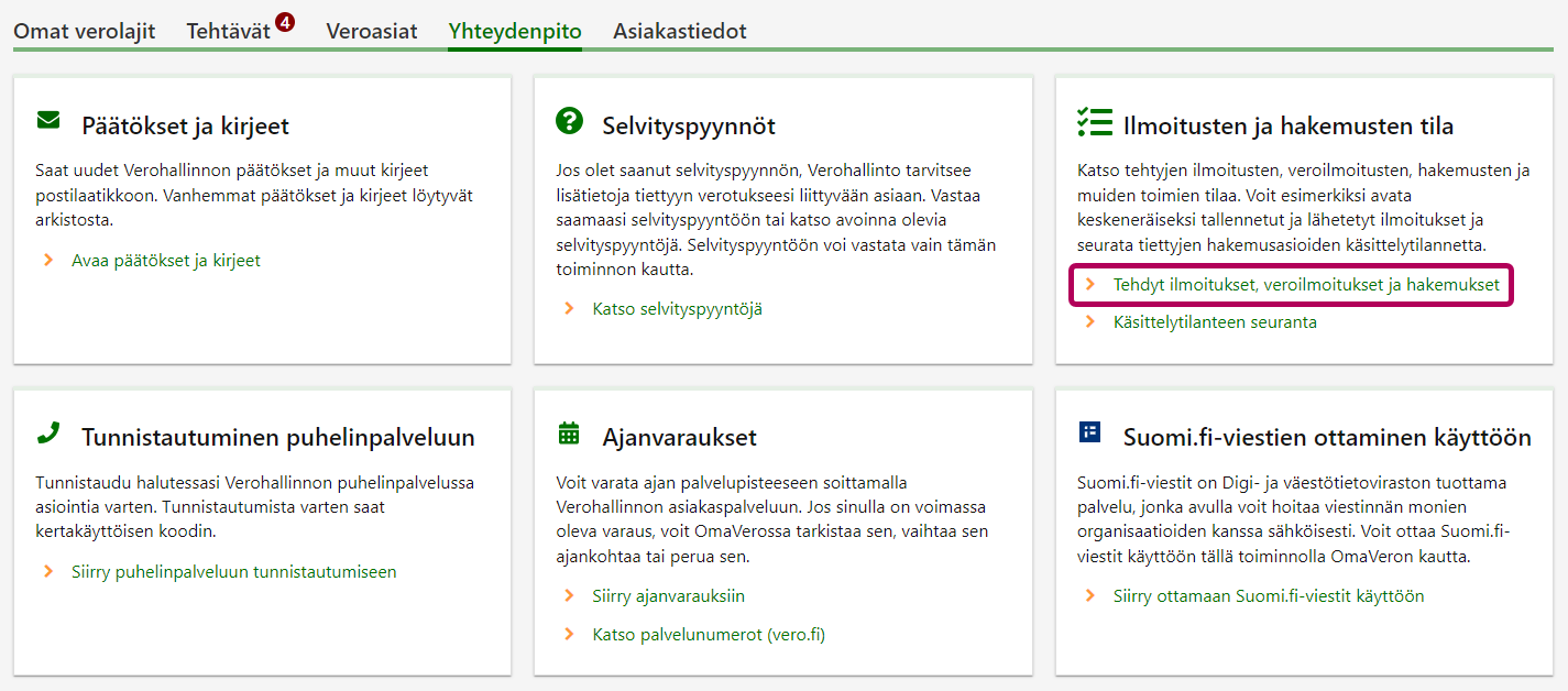 Valitse välilehti Yhteydenpito ja sen jälkeen kohdasta Ilmoitusten ja hakemusten tila linkki Tehdyt ilmoitukset, veroilmoitukset ja hakemukset.