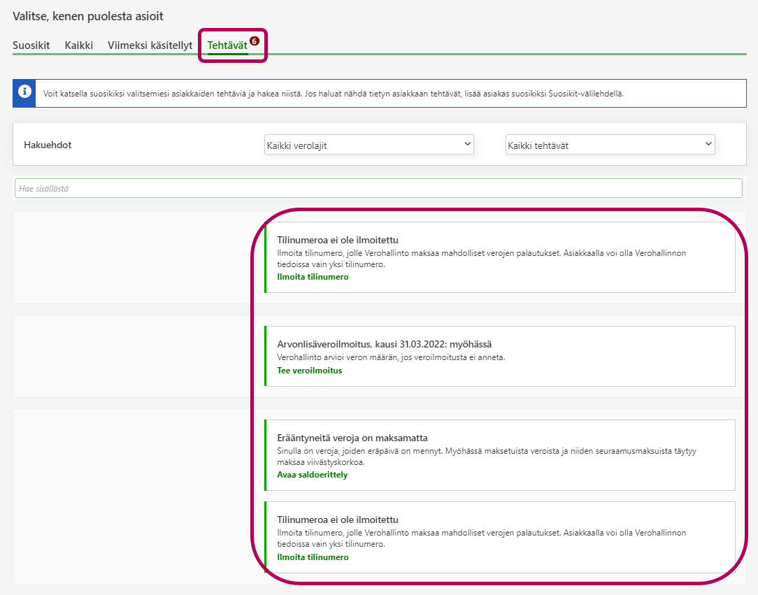 Kun olet valinnut suosikkeja, näet Tehtävät-välilehdeltä listana kaikkien suosikkien avoimet tehtävät. Esimerkiksi tehtävästä ”Erääntyneitä veroja on maksamatta” pääset siirtymään suoraan asiakkaan saldoerittelyyn.