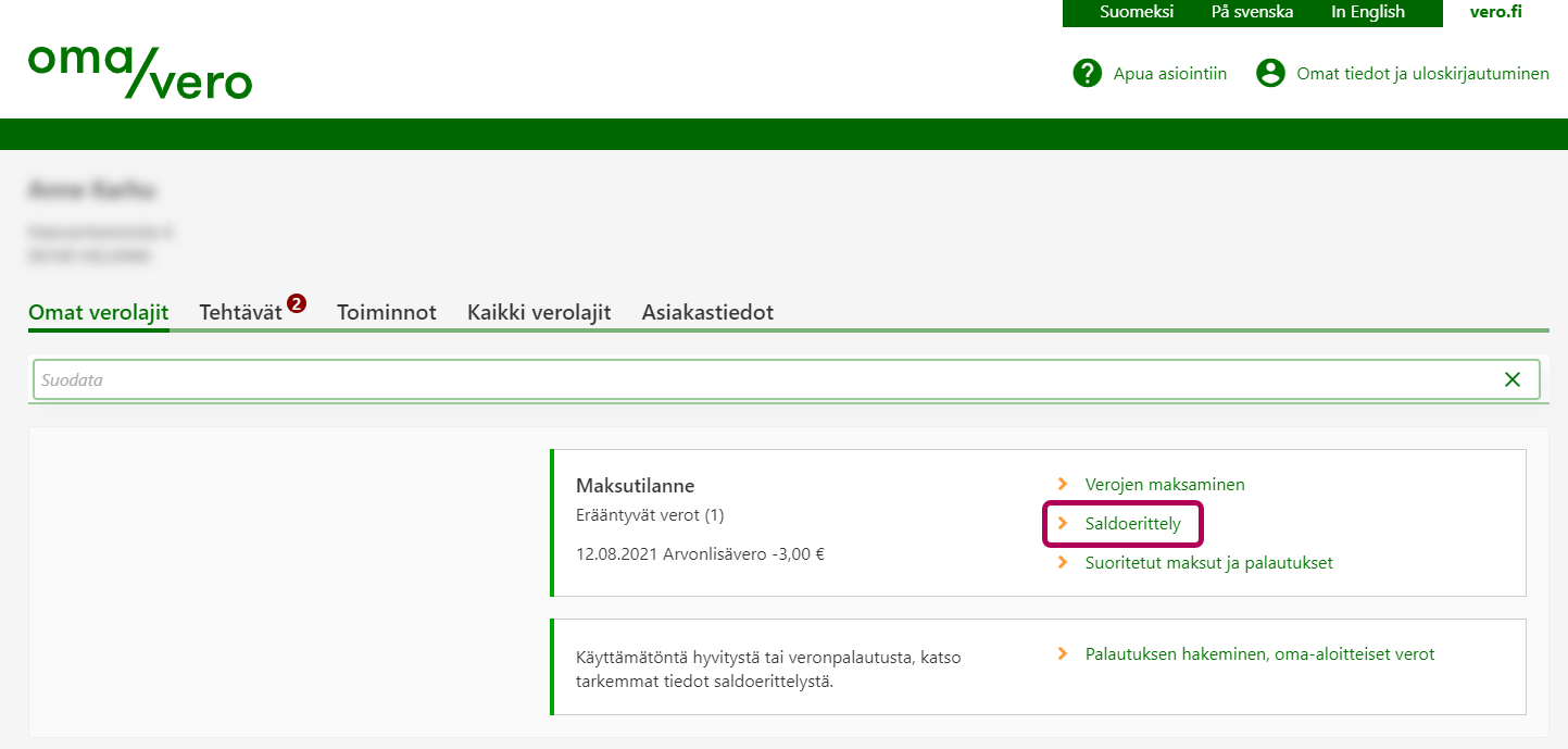 Kun sinulla on hyvitystä (esim. maksuja tai hyvityskorkoa), jota ei ole käytetty velvoitteelle eikä sitä ole palautettu takaisin, näet hyvityksen määrän OmaVerossa olevalta saldoerittelyltä.