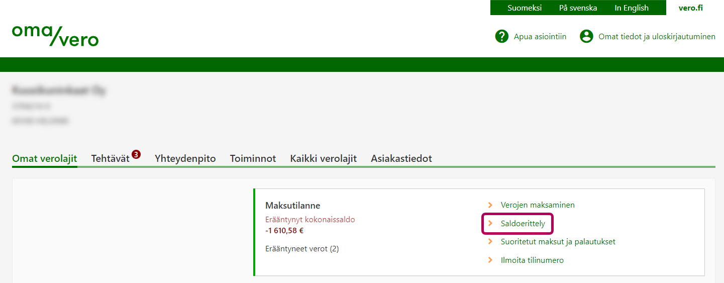 Valitse etusivulta kohdasta Maksutilanne linkki Saldoerittely.