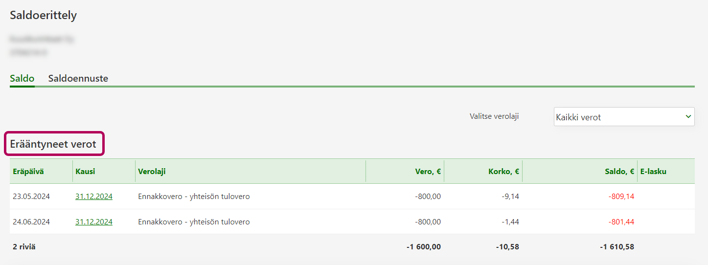 Erääntymisellä tarkoitetaan sitä, että veron eräpäivä on jo mennyt. Jos veron eräpäivä on kuluva päivä, vero ei ole vielä erääntynyt eikä se vielä näy etusivun saldossa tai Saldoerittelyn erääntyneissä veroissa.