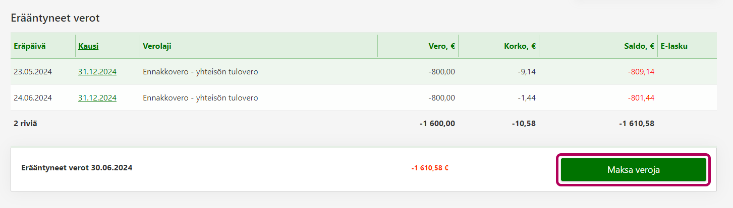 Voit maksaa erääntyneet verot painikkeesta Maksa veroja. Lisätietoja verojen maksamisesta OmaVerossa: Näin maksat veroja OmaVerossa