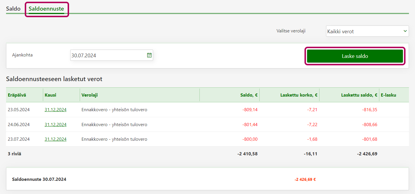 Saldoennusteessa voit arvioida saldon valitulle päivälle enintään 30 päivää eteenpäin. Voit tarkastella joko kaikkien verojen tai yksittäisen veron saldoennustetta.