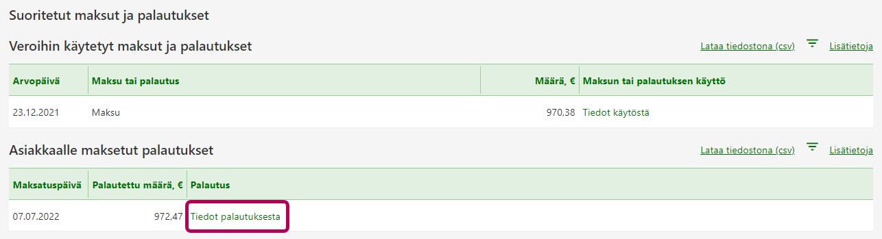 Taulukossa Asiakkaalle maksetut palautukset on eritelty palautuspäivän mukaan asiakkaalle maksetut palautukset. Näet erittelyn palautuksesta, kun valitset linkin Tiedot palautuksesta.