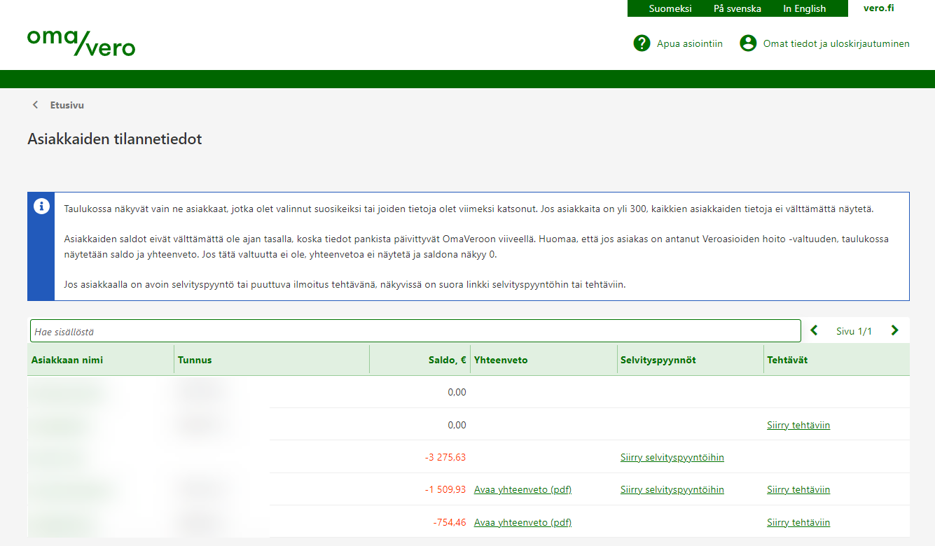 Kirjanpitäjänä näet saldotiedot ja yhteenvedon, kun olet saanut asiakkaaltasi Suomi.fi-valtuuden Veroasioiden hoito. Jos sinulla ei ole tätä valtuutta, et näe yhteenvetoa ja saldona näkyy 0.