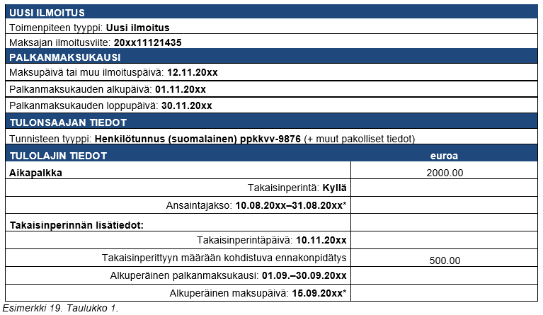 * Ansaintajakso ja alkuperäinen maksupäivä ovat täydentäviä lisätietoja. On suositeltavaa, että takaisinperintätilanteissa maksaja ilmoittaa myös Alkuperäinen maksupäivä -tiedon, sillä Verohallinto tarvitsee tietoa takaisinperittyyn määrään kohdistuvan ennakonpidätyksen kohdistamiseksi oikeaan verokauteen.