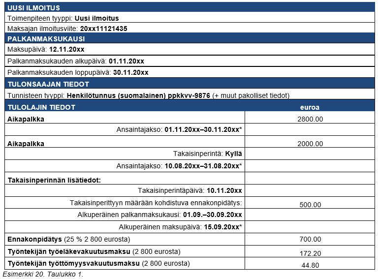 Esimerkki 29 (Perusteeton etu ja takaisinperintä samalla ilmoituksella): Tulonsaajalle on maksettu 3 000 euroa palkkaa. Suorituksen maksaja toimittaa tulosta ennakonpidätyksen (20 %). Samassa palkanmaksussa tulonsaajalta on peritty edellisen palkanmaksun yhteydessä maksettu 150 euron liikasuoritus takaisin. Suoritus peritään takaisin bruttona. Tiedot on ilmoitettu tulorekisteriin normaalisti.