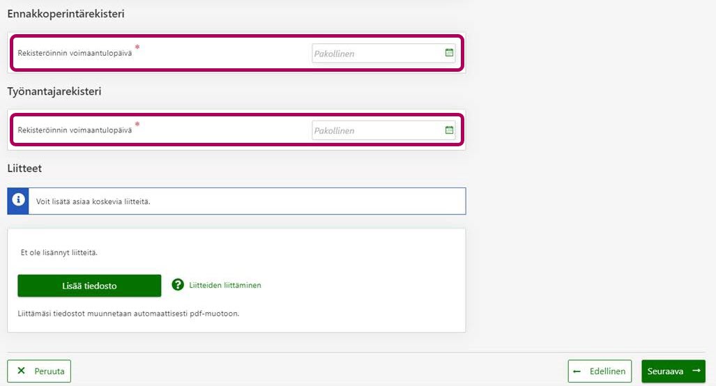 Valitse sivulta ne rekisterit, joihin olet liittymässä. Merkitse jokaisen rekisterin kohdalle, haluatko liittyä rekisteriin vai etkö halua. Siirry sivun alareunasta seuraavalle sivulle.
